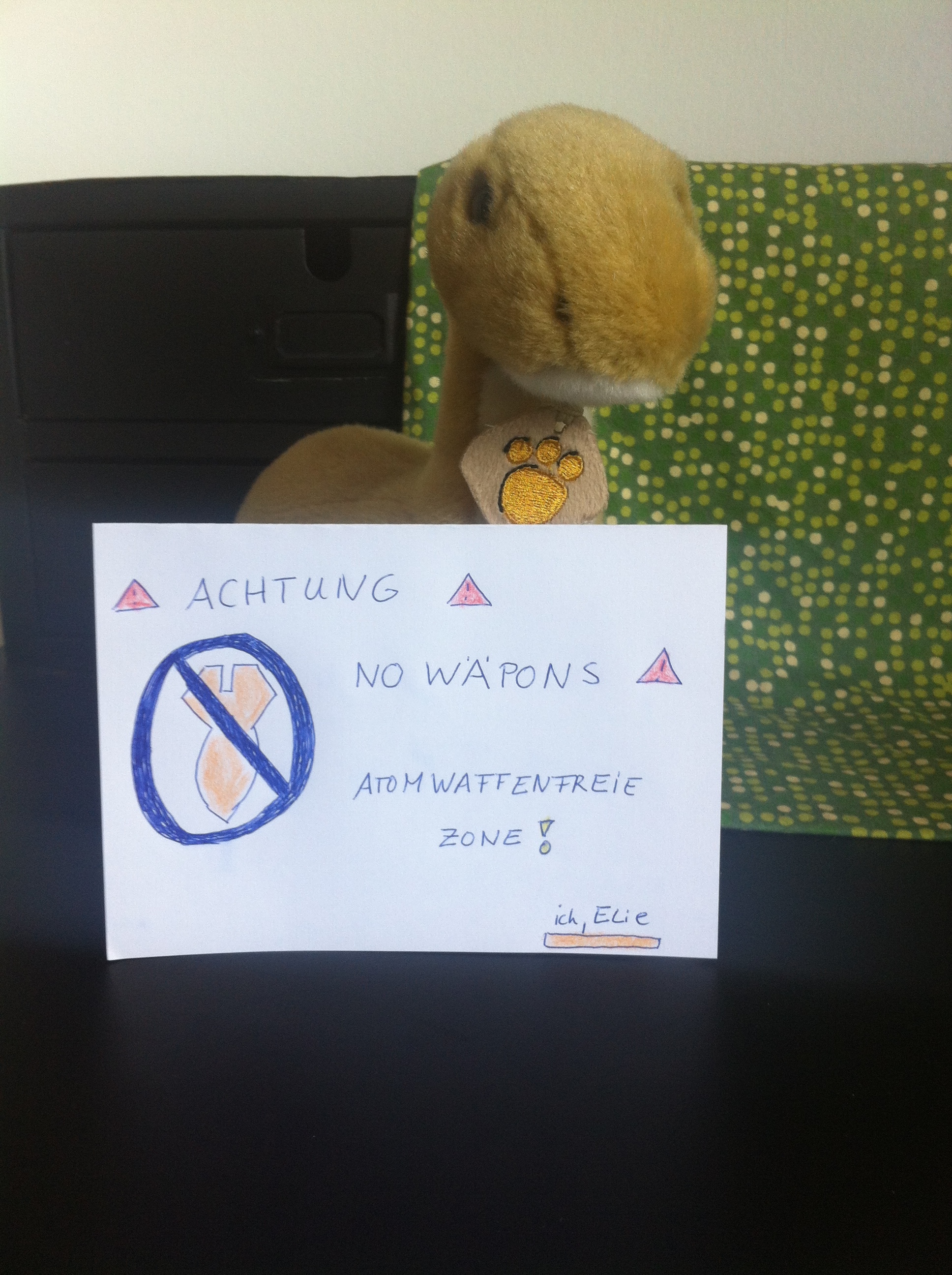 Anatol stöhnt. „Elie, ich beschäftige mich rein theoretisch mit Atomphysik. Da ist nichts mit nuklearer Strahlung oder so. In meinem Referat geht es nicht um Kernspaltung. Es ist völlig ungefährlich. Du brauchst nicht mal in Deine atomwaffenfreie Zone zu gehen, um in Sicherheit zu sein. Außerdem bist Du sowieso die ganze Zeit von Atomen umgeben – selbst in Deinem atomwaffenfreien Zimmer. Alles besteht aus Atomen. Übrigens kann man sogar Atomphysiker sein und sich trotzdem gegen Atomwaffen und Kernkraftwerke aussprechen.“